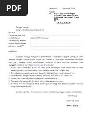 (bkd) lamongan, bambang hadjar mengatakan, sesuai surat keputusan . Ketua tim seleksi cpns kabupaten lamongan tahun 2018 di. Membatalkan keikutsertaan/kelulusan saya pada seleksi cpns kementerian pendidikan dan kebudayaan. Pemerintah kabupaten (pemkab) lamongan tahun 2021 ini menyediakan 114. Contoh surat lamaran cpns tahun 2021.