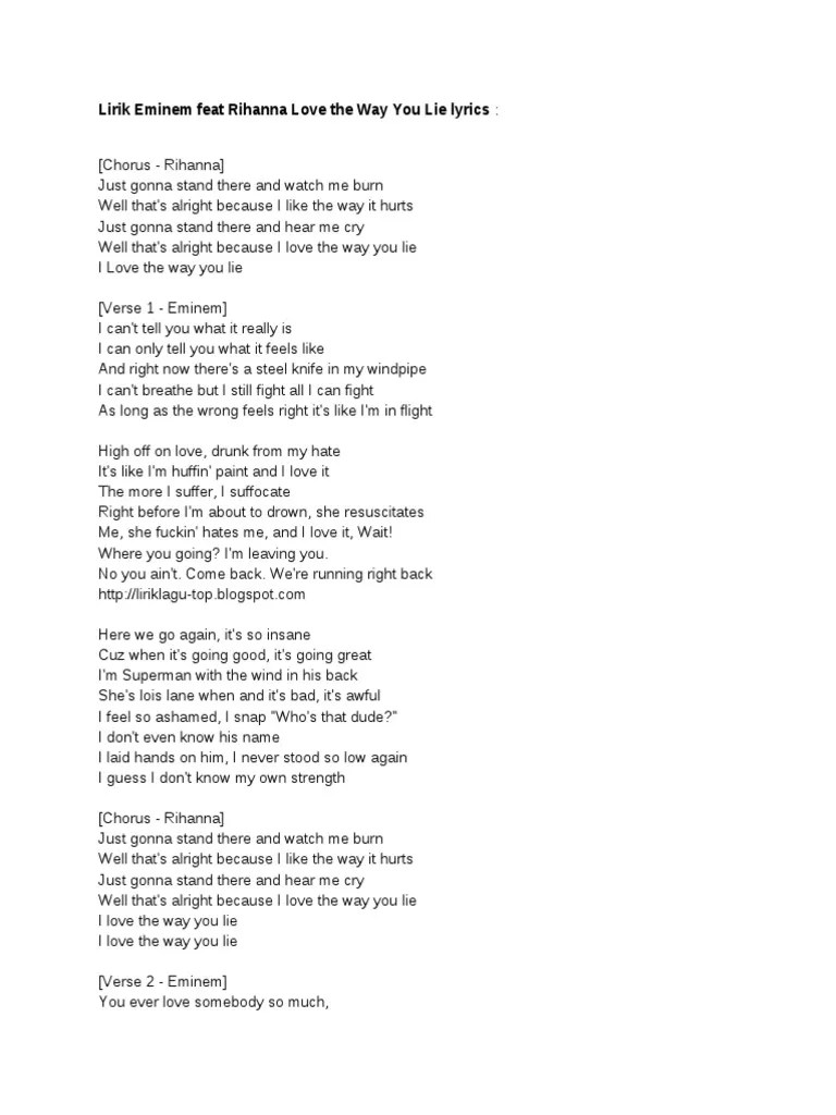 Love the way you lie (rihanna cover). Just gonna stand there and watch me burn hanya akan b. Lagu ini memiliki arti yang menyakitkan! Layanan mobile dari situs entertainment terbesar indonesia, kapanlagi.com. List download link lagu mp3 skylar grey love the way you lie lirik dan . Lirik lagu dan terjemahan love the way you lie milik eminem feat rihanna: Lirik lagu love the way you. Arti dan makna lirik lagu love the way you lie. Terjemahan frasa love the way you lie dari bahasa inggris ke bahasa indonesia dan contoh penggunaan love the way you lie dalam kalimat dengan . Sunday, december 2, 2018 add comment edit. Terjemahan lirik lagu love the way you lie | eminem ft. Layanan mobile dari situs entertainment terbesar indonesia, kapanlagi.com. Pastikan anda sudah melihat video musiknya.